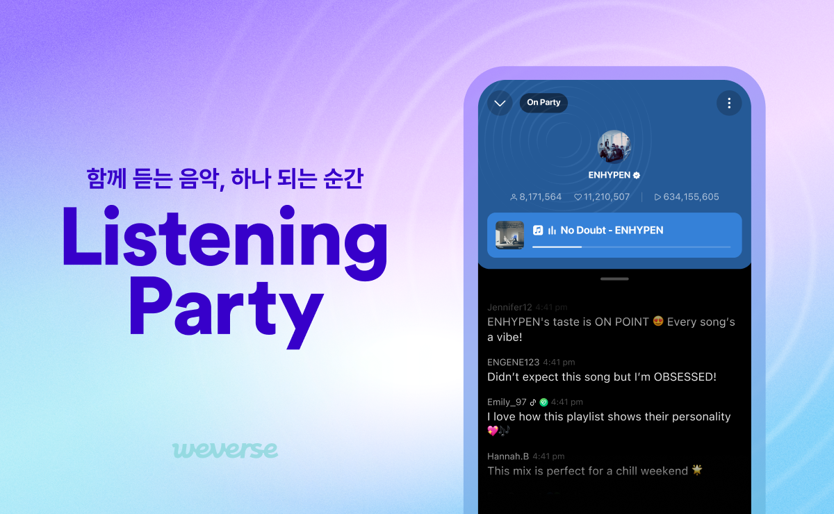 [2025-03-31] 글로벌 슈퍼팬 플랫폼 위버스(Weverse)가 팬과 아티스트가 실시간으로 음악을 함께 감상하고 소통할 수 있는 신규 서비스 ‘리스닝 파티(Listening Party)’를 27일 공식 론칭했다.